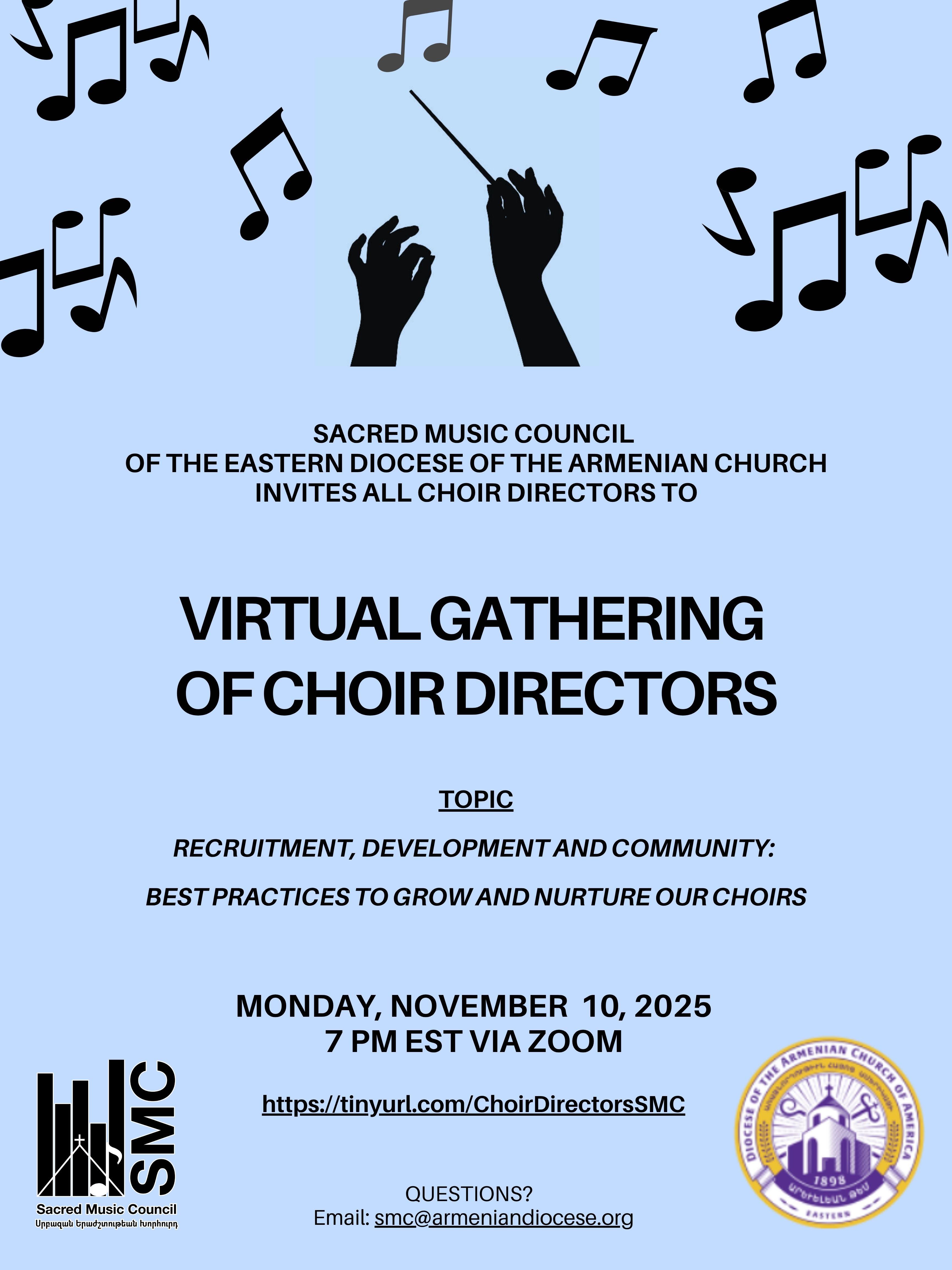 The Sacred Music Council of the Eastern Diocese of the Armenian Church invites all choir directors to the next Quarterly Virtual Gathering of Choir Directors on Monday, November 10, 2025, at 7:00 PM (EST) via Zoom.